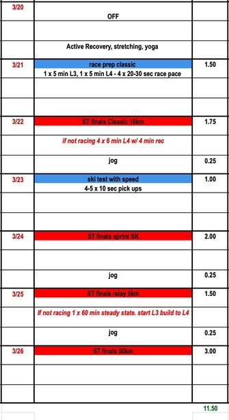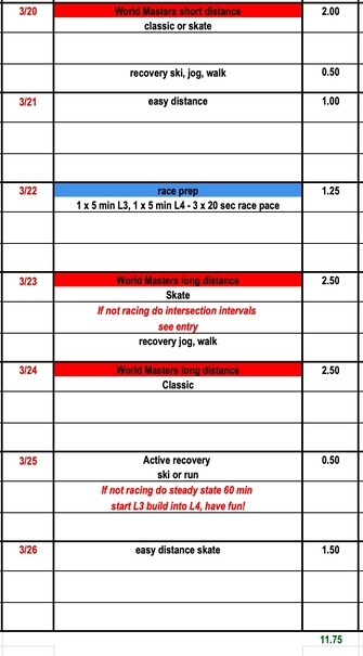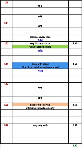 Late Season Training tips for ideas. While skiing conditions last, the spring is a great time to continue to refine our ski technique. This week we recommend a new body weight double pole drill and some no pole skating speeds. If your racing season has come to and end, we recommend some fun/hard intervals like