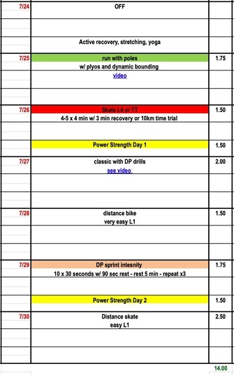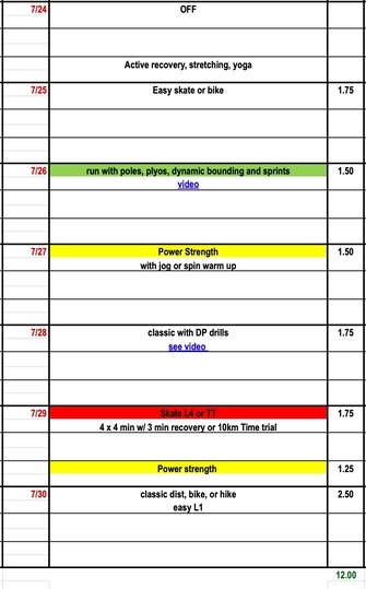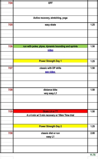 This week we add in some mid-summer intensity in the form of a rollerski TT and a power building spenst session. If you do not have suitable terrain for a time trial this session can be substituted with some L4 intervals. Remember on intensity weeks to keep the easy distance skiing very easy. We start a new power-based strength plan, check out