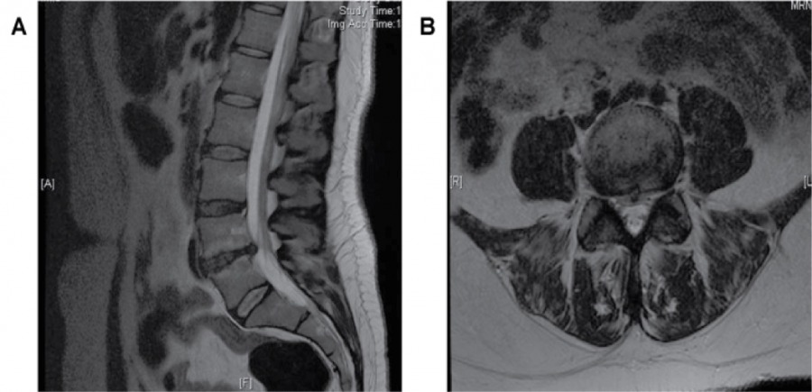 MRI of the lumbar spine with discs clearly visible. Note L4-5 discal degeneration.