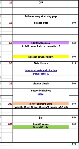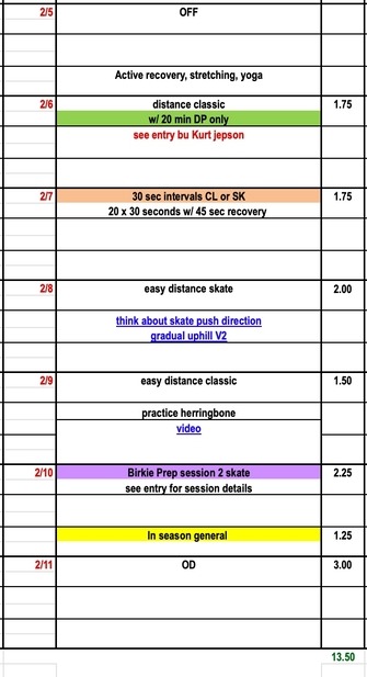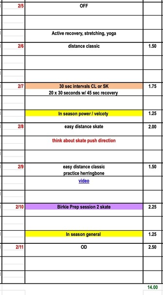 This week the elite and master plans continue our marathon training block phase. We increase the total number of L1 training hours for the week and recommend a short 30-second interval session. Check out the Birkie Prep Session 2 (see entry for more details) for a unique session to build marathon specific fitness. Use distance days to log easy L1 training and practice technique that will make you more efficient. Check out Herringbone Fundamentals and Direction of Skate push for tips on technical adjustments that will drastically increase efficiency.