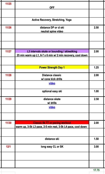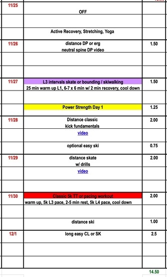 Welcome to Thanksgiving volume week! One of our favorite times of year. This week's workout recommendations are great for folks transitioning to snow and for those still cross training. Factory Team members Annika Landis and Simon Zink share some of their favorite early season drills to improve gliding and comfort on skis. Is the double pole crunching motion a thing of the past? We discuss in our new series on neutral spine double pole motions and mechanics. We also post helpful drills to improve classic kick timing, perfect early season drills to do on snow or test them out on rollerskis to improve your balance. (if you are not skiing on snow replace the L3 skate intervals with bounding, ski walking, or hiking with poles.)