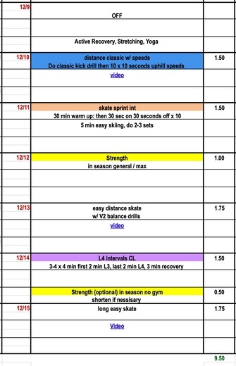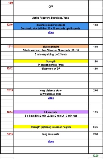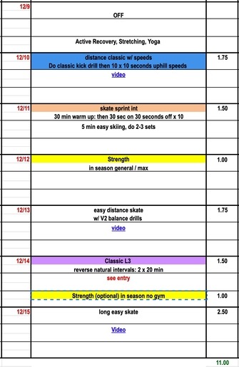 This week we focus on technique and fitness building for the season. Remember that almost all on-snow skiing sessions can incorporate some no-pole skiing and drill work. Try out our new V2 Balance video for a no-pole progression designed to improve stability and body position. Still getting used to kicking skis on snow? Check out our basic classic kicking drills to improve kick timing. This week we recommend L4 intervals in the junior and elite plans and reverse natural intervals of the masters group.